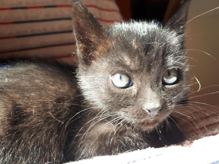 Nuit es una preciosidad negra como el carbón. Fue rescatada del motor de un coche y se encuentra en una casa de acogida, mostrando que es una loquilla, un auténtico terremoto. Estamos buscando familia para esta divertida minipanterita.