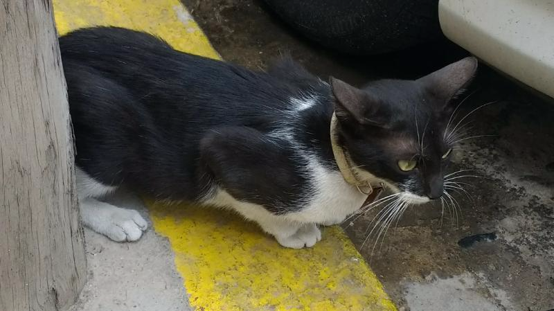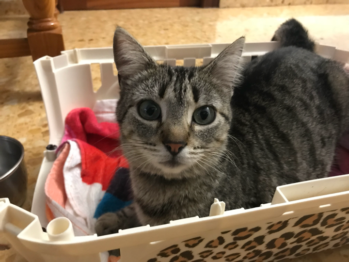 Es una gata parda joven, lleva un collar negro y quiere estar con las personas, se encuentra en un estado de embarazo.
