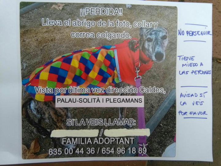 Galga atigrada perdida.Tiene chip. Es de Palau-solita i Plegamans. Tamaño grande 4 años. Muy asustadiza.Si la ven, no la cojan porque huye, avisen a T. 635004436 y policia local de Palau solita T 948649696
