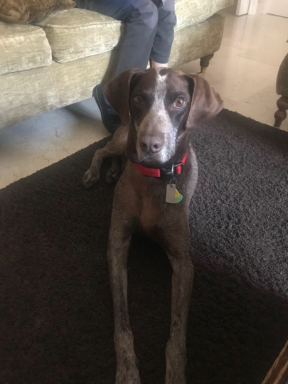 Zurdo se ha escapado después de salir del veterinario. Se ha asustado cuando estaba medio dormido y ha estado corriendo sin sentido por la carretera hacia el casar. Lleva el arnes y la correa colgando a juego color rojo. Lleva varios numeros de telefono en el collar. Es un braco Aleman de 20 kg. Marron.