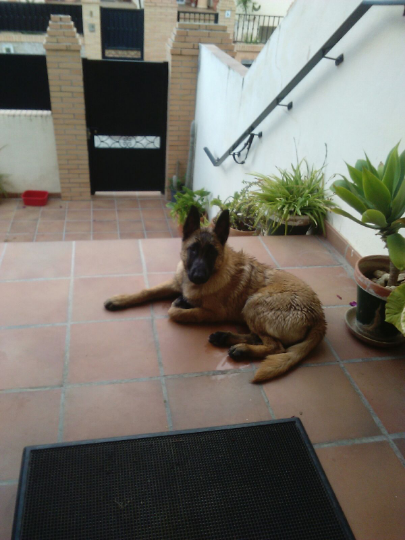Pastor belga malinois, color marrón claro y ocico negro, 5 meses de edad, llevaba un collar con los colores de la bandera de España, responde al nombre de "Cuco"
