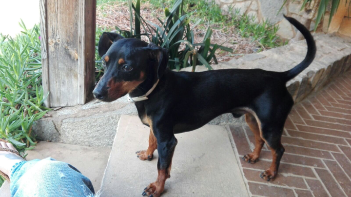 Es un pinscher castrado de color marron y negro es un poco arisco y no se deja tocar y es asustadizo.