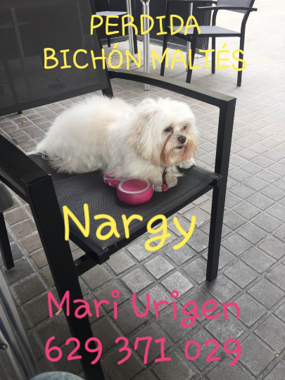 Bichón Maltés hembra de 6 años, color blanco. Se llama Nargy y se escapó anoche 15/06/2019, entre St. Antoni y Palamós.