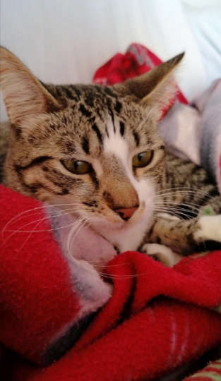 Hembra gris, atigrada, blanca con rayitas negras. Pelo corto y ojos amarillos. Responde al nombre de mishi o Gatibela. Es muy miedosa pero si se acerca despacio se puede coger.