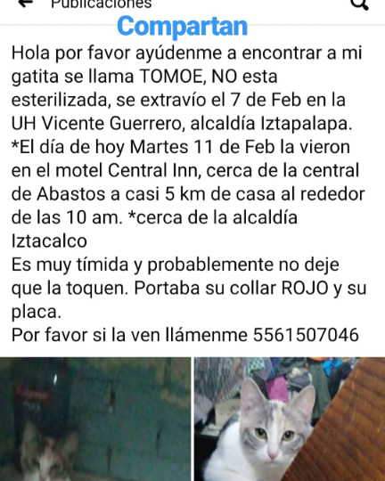 Se llama Bella, es una gatita siames de 5 años, es muy asustadiza. Se perdió el 02/02/20. Es chica de tamaño, si la ven por favor contactarse al 3764351913. Se ofrece recompensa.