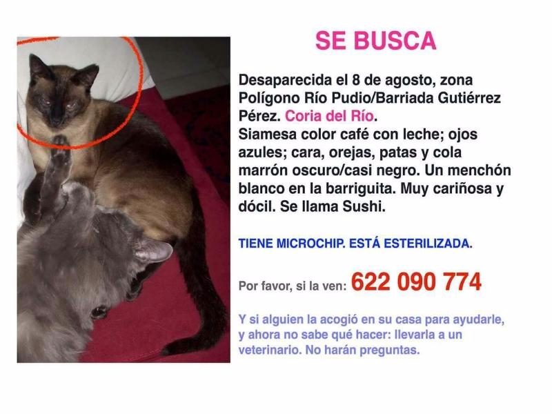 Perdida gata siamesa con chip. Se llama Sushi y está esterilizada. Perdida el 8 de agosto de 2017