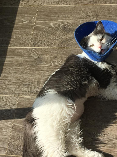 Gata pelo largo, blanca y gris. Llevaba collar isabelino azul