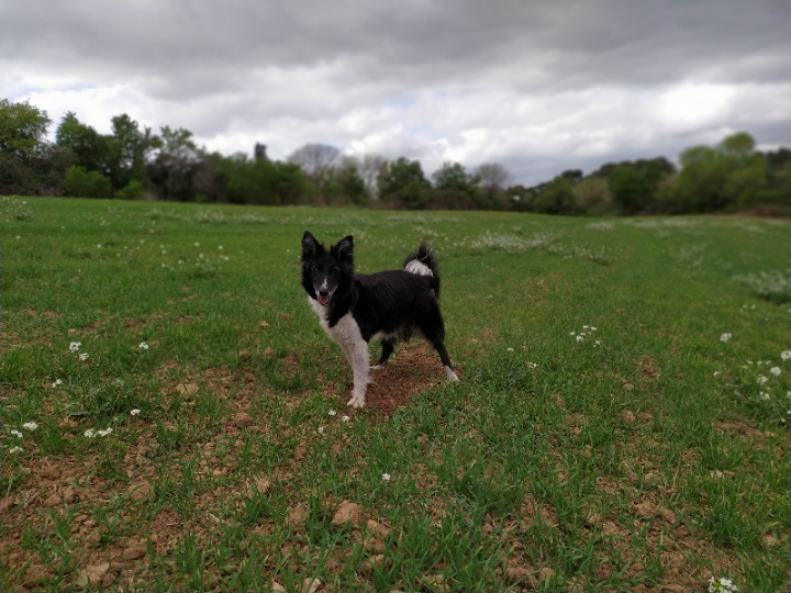 Es hembra, tamaño medio, mezcla Border Collie, negra con algo de blanco. Tiene 11 años