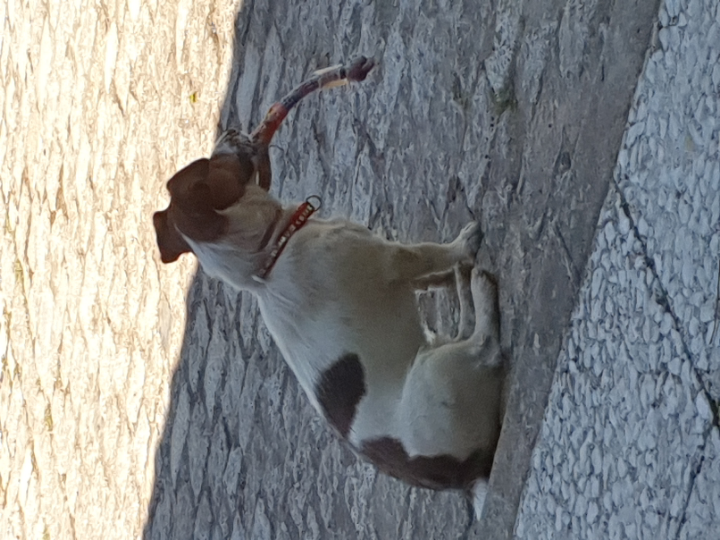 Perro mediano blanco con manchas marrones y negras, se llama Polo. Collar rojo con gris fosforescente finito.