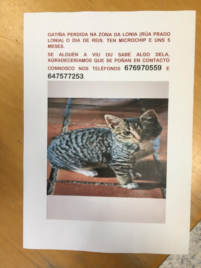 Se me perdio mi gatita sus características tiene una manchita abajo de el ojo derecho y tiene una mancha en forma E en la oreja por dentro su color de pelaje es blanca con amarillo si la vieron por favor contactenme puedo dar hasta 50.000 por la gatita