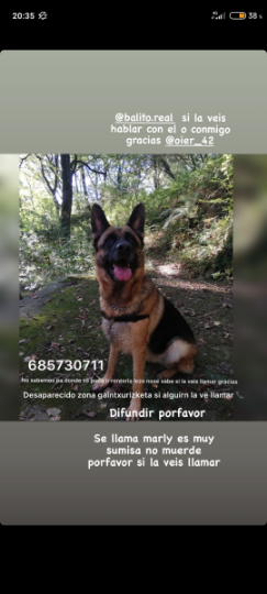Pastor Alemán pérdida ayer en gaintxurizketa, última vez vista en el Mercadona de Oiartzun ayer alas ocho de la tarde, si la veis llamar al número 685730711, sin collar, se llama Marly y no muerde ⚠️⚠️