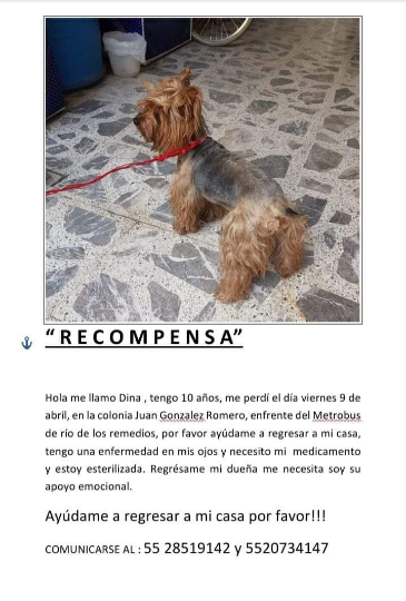 El día viernes 9 de abril por la tarde Dina salió de la casa donde 2 sujetos la tomaron, la chica con el tiempo encima confío en aquel chico que se acercó diciendo que iba a subirla a redes pero nunca lo hizo, hasta el momento se ha publicado en todos lados como para que todos lo vean y no la han devuelto. Tenemos las cámaras donde se ve que la agarraron.