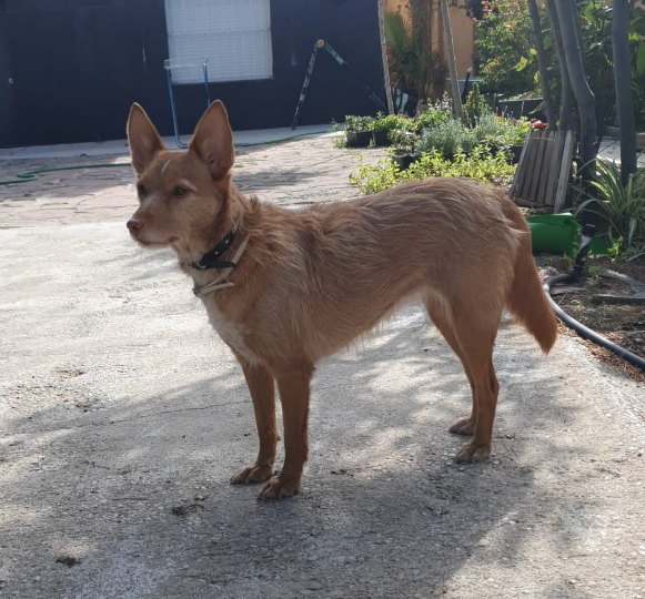 Podenca pelirroja de tamaño pequeño-mediano. Tiene chip y dos collares (desparasitario y de paseo).