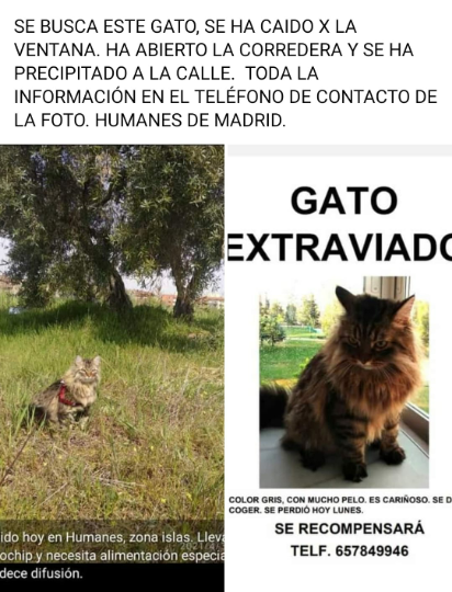 Atiende al nombre de Silver, ha saltado por la ventana, por lo que puede estar herido. Muy cariñoso, necesita comida especial. Por favor, rogamos ayuda. Se ofrece recompensa 200€.