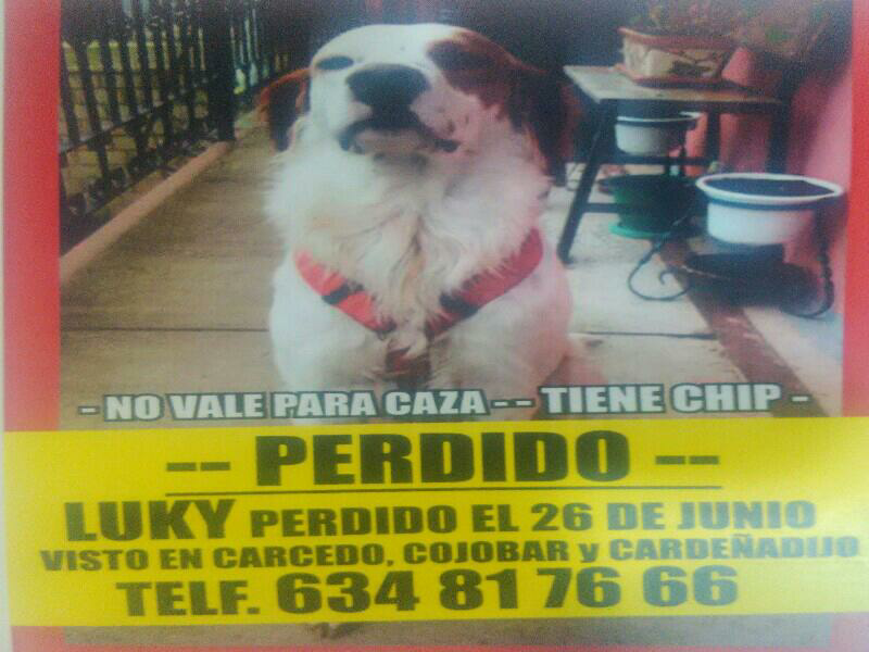Perro de tamaño mediano y ocho años de edad. Mezcla de setter irlandés con pelaje blanco y manchas marrones, las más características son las de las orejas y la que le cubre el ojo izquierdo.