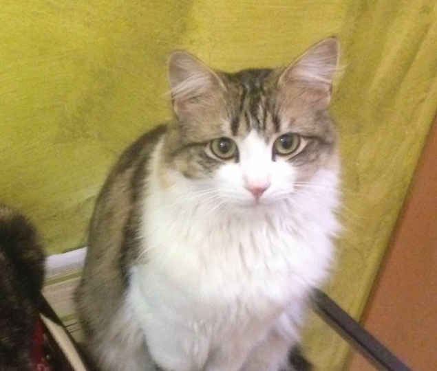 Gato de pelo largo, perdido por la zona de Rambla Baixa, es blanco por la parte de abajo y de varios colores (entre grises y marrones) por arriba. Tiene chip.